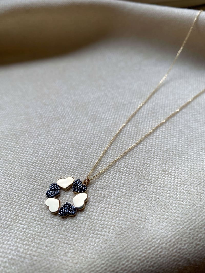 Piękny naszyjnik Kółko z serduszek przyciągnie wzrok każdego. Jest elegancki i ponadczasowy. Ozdobiony jest trzema złotymi serduszkami oraz trzema serduszkami z onyksami.