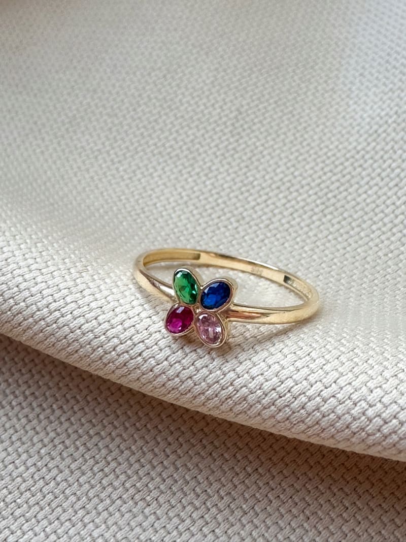 Piękny pierścionek Kwiatek jest kobiecy, dodaje uroku i sprawia, że dłoń wygląda bardzo subtelnie. Ozdobiony jest kolorowymi cyrkoniami, co sprawia że pasuje do każdej stylizacji.
