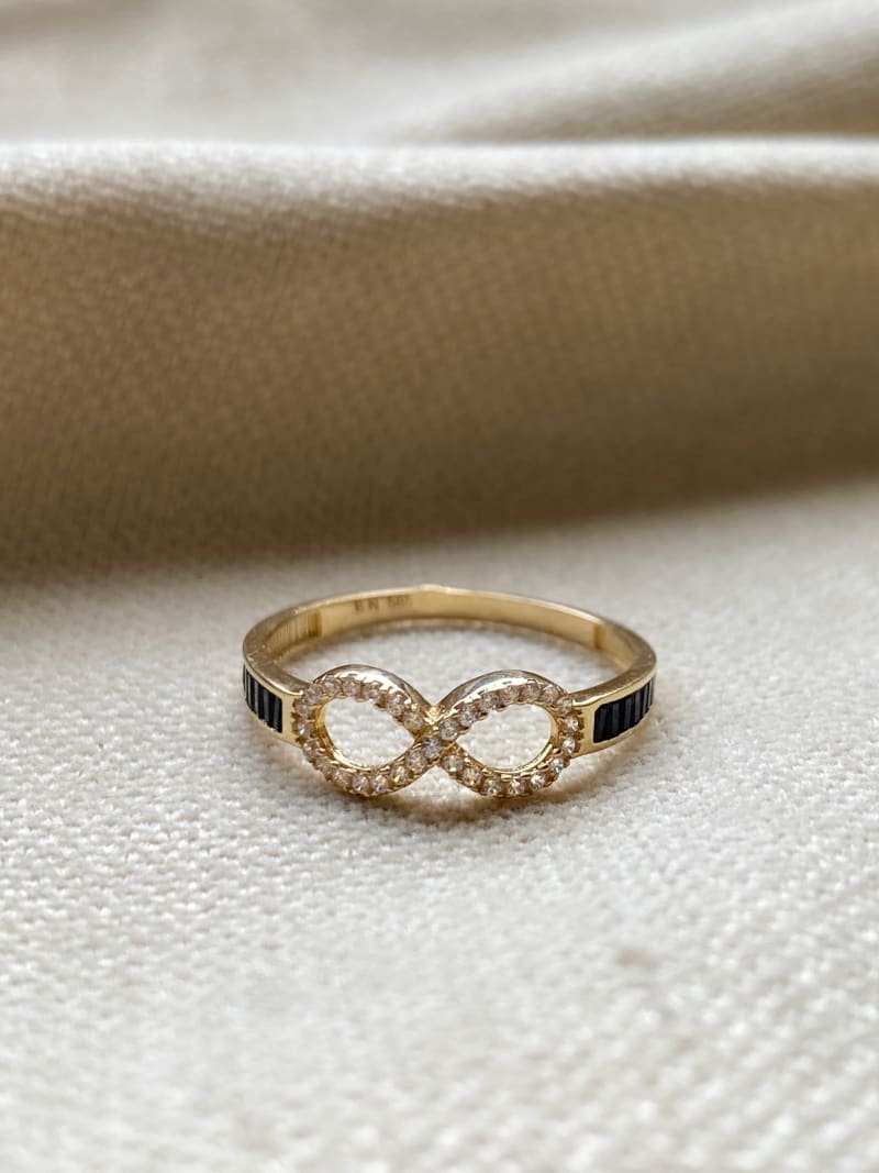 Piękny pierścionek ze znakiem nieskończoności jest elegancki, ponadczasowy i bardzo modny. Ozdobiony jest cyrkoniami oraz czarnymi kamieniami, co sprawia że pasuje do każdej stylizacji.